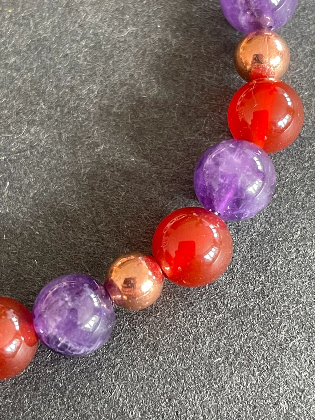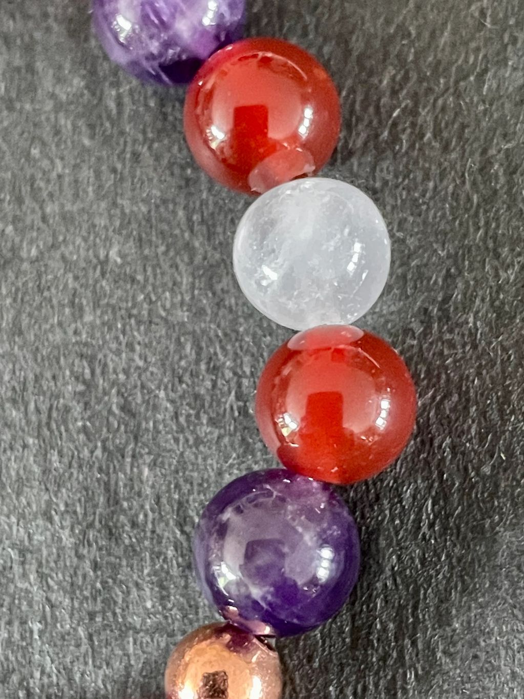 This pure copper toggle catch bracelet has 8mm round amethyst and rose quartz, pure copper spacer beads and 8mm red carnelian.